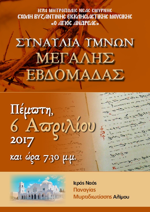 Σας Ανακοινώνουμε ότι η Σχολή Βυζαντινής Εκκλησιαστικής Μουσικής «Ο Άγιος Ανδρέας» της Ιεράς Μητροπόλεώς μας εν όψει της Μεγάλης Εβδομάδας και της εορτής του Αγίου Πάσχα, διοργανώνει Συναυλία με επίκαιρους εκκλησιαστικούς ύμνους.