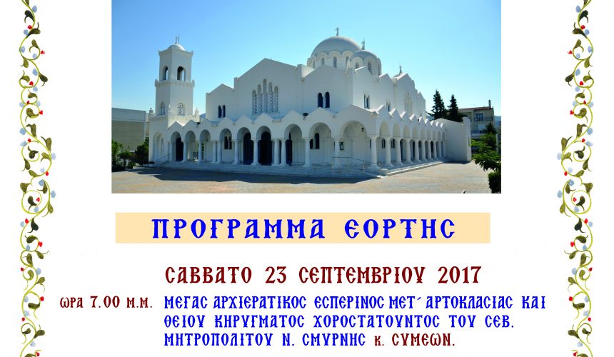 Σάββατο 30/12/2017, – Του Αγίου Γεδεών Καρακαλληνού: ώρα 07:00 – 09:00: Όρθρος Θεία Λειτουργία ώρα 17:00: Εσπερινός Κυριακή προ των Φώτων και Απόδοση Εορτής των Χριστουγέννων 31/12/2017 ώρα 07:00-10:00: Όρθρος – Θεία Λειτουργία ώρα 17:00: Εσπερινός ΔΕΥΤΕΡΑ 1/1/2018 – Η ΠΕΡΙΤΟΜΗ ΤΟΥ ΚΥΡΙΟΥ ΗΜΩΝ ΙΗΣΟΥ ΧΡΙΣΤΟΥ – ΤΟΥ ΑΓΙΟΥ ΠΑΤΡΟΣ ΗΜΩΝ ΒΑΣΙΛΕΙΟΥ ώρα 07:00 – 10:20: ΌΡΘΡΟΣ – ΘΕΙΑ ΛΕΙΤΟΥΡΓΙΑ (ΜΕΓΑΛΟΥ ΒΑΣΙΛΕΙΟΥ) -ΔΟΞΟΛΟΓΙΑ ΝΕΟΥ ΕΤΟΥΣ ΚΑΙ ΚΟΠΗ ΕΝΟΡΙΑΚΗΣ ΒΑΣΙΛΟΠΙΤΑΣ ΜΗΝ ΞΕΧΑΣΟΥΜΕ ΝΑ ΠΡΟΜΗΘΕΥΤΟΥΜΕ ΤΑ ΗΜΕΡΟΛΟΓΙΑ ΤΟΥ 2018 ΑΠΟ ΤΟ ΝΑΟ!