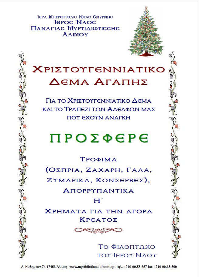 Το Ενοριακό Φιλόπτωχο Ταμείο του Ιερού Ναού Παναγίας Μυρτιδιώτισσας Αλίμου, συνεχίζοντας την πολυετή παράδοση φιλανθρωπίας με την φροντίδα των ευλαβών μελών του, των κυριών που το απαρτίζουν, θα μοιράσει και εφέτος ενόψει της μεγάλης Εορτής των Χριστουγέννων τα τακτικά και έκτακτα χρηματικά βοηθήματα καθώς και τρόφιμα και είδη πρώτης ανάγκης σε οικογένειες που αντιμετωπίζουν οικονομικά προβλήματα.
