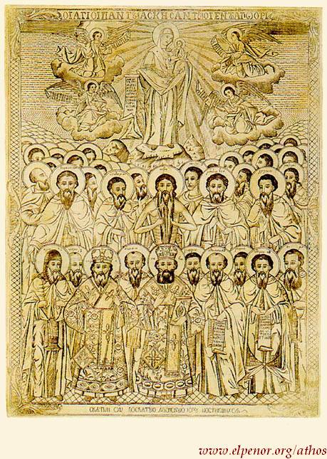 Τοὺς τοῦ Ἄθω πατέρας καὶ ἀγγέλους ἐν σώματι, Ὁμολογητὰς καὶ Ὁσίους, Ἱεράρχας καὶ Μάρτυρας, τιμήσωμεν ἐν ὕμνοις καὶ ᾡδαῖς, μιμούμενοι αὐτῶν τὰς ἀρετάς, ἡ τοῦ Ὄρους πληθὺς πᾶσα τῶν Μοναστῶν, κραυγάζοντες ὁμοφώνως· δόξα τῷ στεφανώσαντι ὑμᾶς, δόξα τῷ ἁγιάσαντι, δόξα τῷ ἐν κινδύνοις ἡμῶν προστάτας δείξαντι.