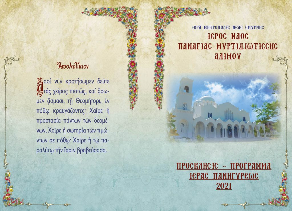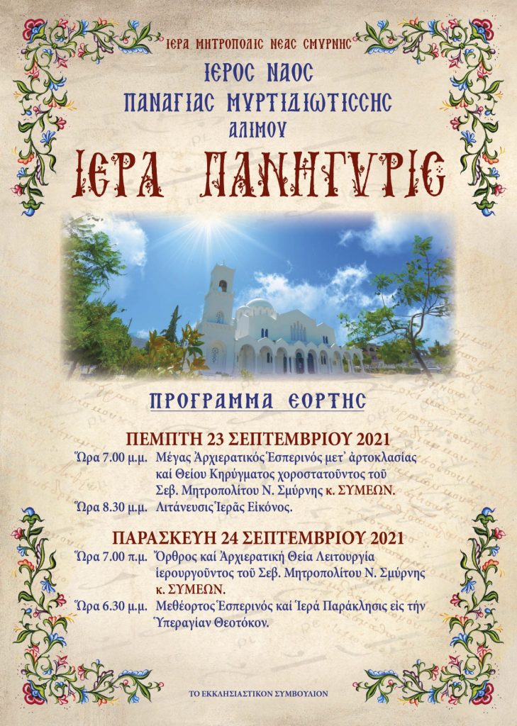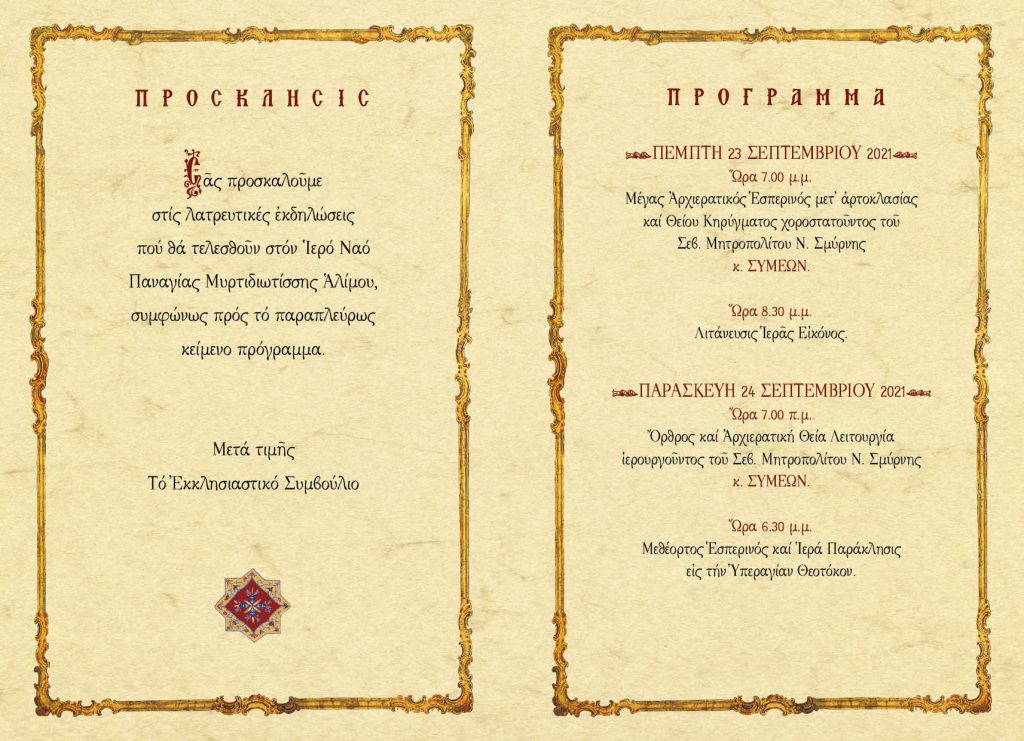 Σας προσκαλούμε στις λατρευτικές εκδηλώσεις που θα τελεστούν στον Ιερό Ναό Παναγίας Μυρτιδιώτισσας Αλίμου σύμφωνα με το παρακάτω πρόγραμμα: